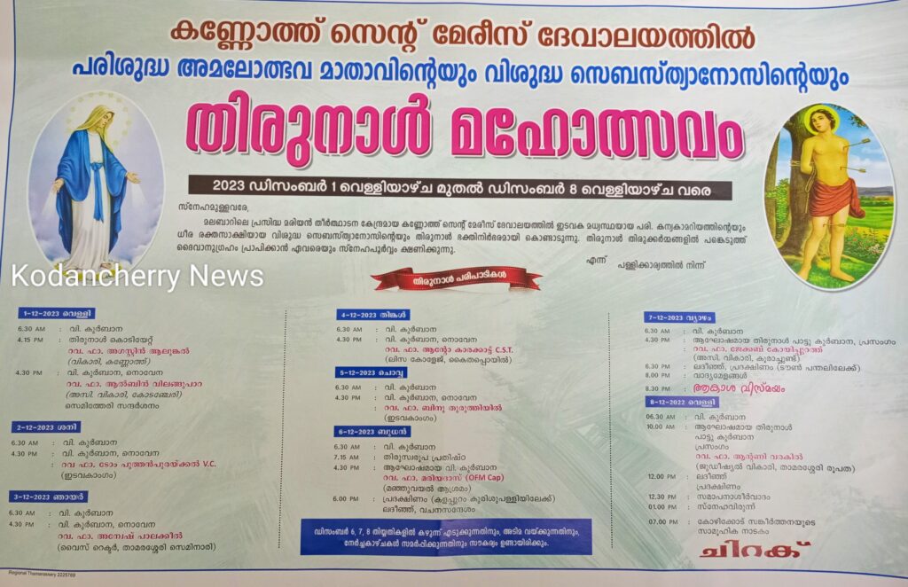 കോടഞ്ചേരി: കണ്ണോത്ത് സെന്റ് മേരീസ് ദേവാലയത്തിൽ പരിശുദ്ധ അമലോത്ഭവ മാതാവിന്റെയും വിശുദ്ധ സെബസ്ത്യാനോസിന്റെയും തിരുനാൾ മഹോത്സവം2023 ഡിസംബർ 1 വെള്ളിയാഴ്ച മുതൽ ഡിസംബർ 8 വെള്ളിയാഴ്ച വരെ നടക്കും.