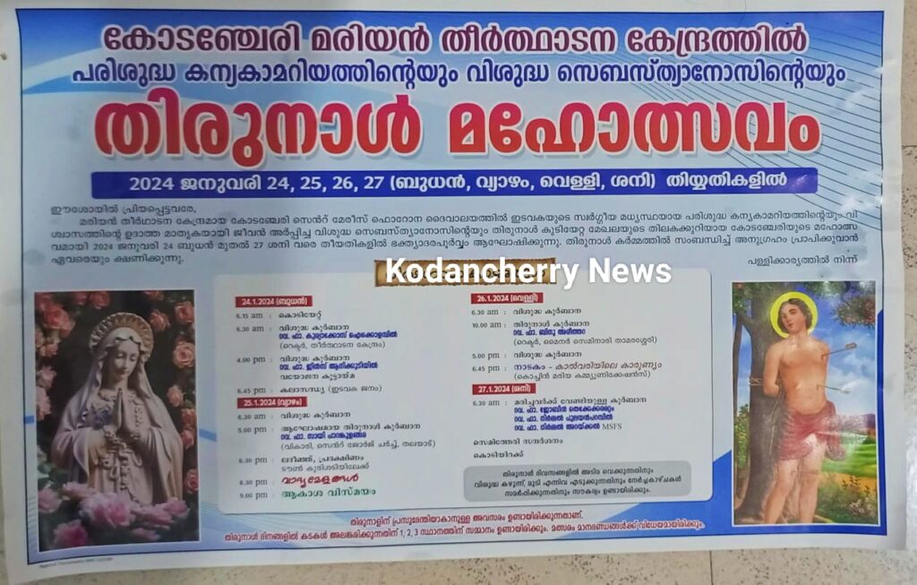 കോടഞ്ചേരി മരിയൻ തീർത്ഥാടന കേന്ദ്രത്തിൽ പരിശുദ്ധ കന്യകാമറിയത്തിൻ്റെയും വിശുദ്ധ സെബസ്ത്യാനോസിന്റെയും തിരുനാൾ മഹോത്സവം. 2024 ജനുവരി 24, 25, 26, 27 (ബുധൻ, വ്യാഴം, വെള്ളി, ശനി) തിയ്യതികളിൽ