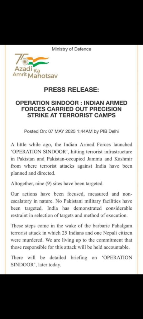 തിരിച്ചടിച്ച് ഇന്ത്യ; പാകിസ്ഥാനിലെ ഭീകര കേന്ദ്രങ്ങൾ ആക്രമിച്ചു, 9 പാക് ഭീകര കേന്ദ്രങ്ങൾ തകർത്തെന്ന് കരസേന